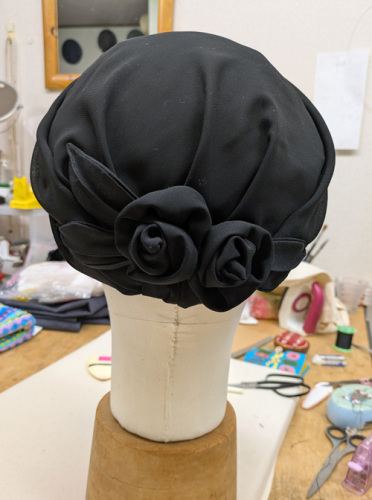 | 表生地は薄地ジョーゼットで作りましたが 土台はチップから黒寒冷紗で型を取り シャポースタンに被せてドレープを取っています。 |