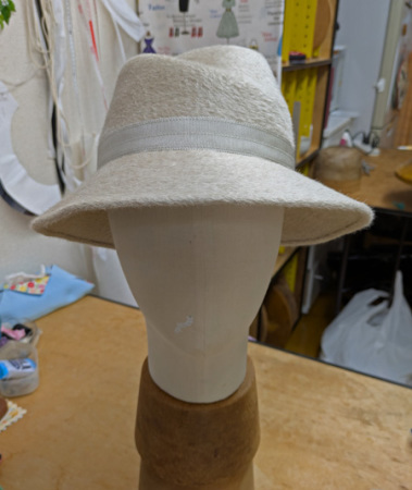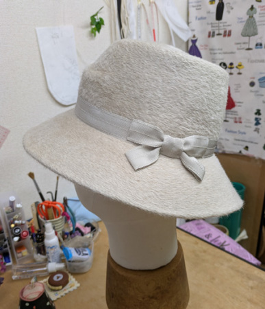 オフ白ベジューサ帽体キャプリン型で ご注文の帽子を作りました。 春にも充分被れます。 |