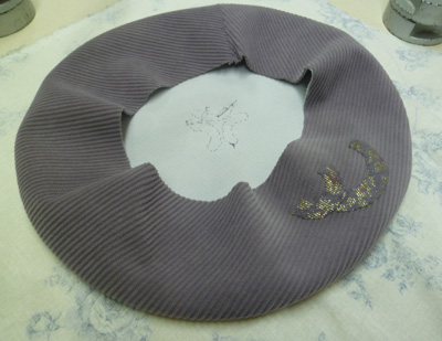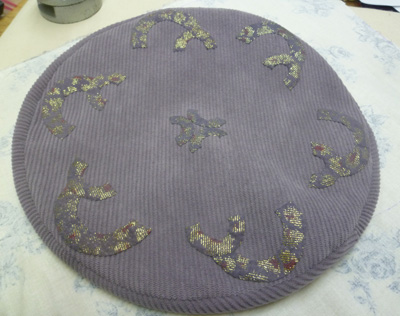 | 春向きベレー帽、 コーデュロイの生地にゴールドをあしらった、 革をアップリケしています。 実物のパープルはもっと素敵な春色です。 |