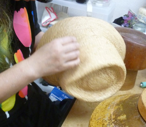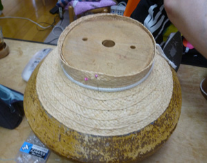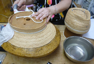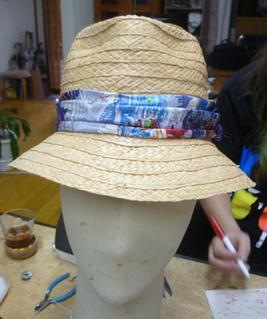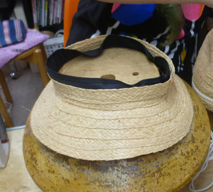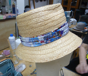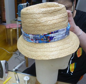ラファイアブレードで中折れハットを製作しています。 ブリムにサイズリボンを先に付けます。 ブリムとクラウンを縫い合わせ、ネクタイ生地でサイズ元を巻いています。 ご主人の帽子だそうです。まだ、暑いから、充分被れます。