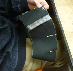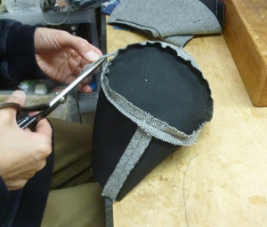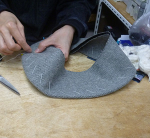 ウールの生地で、クロッシェを製作中です。クラウンの次はブリムを縫います。 クラウン、表生地が縫えました。、ブリムにステッチをしますがずれない様にハ刺しをしています。