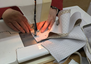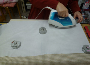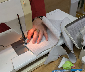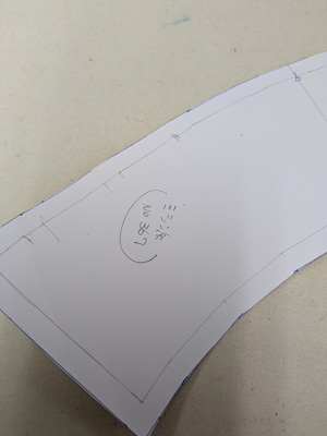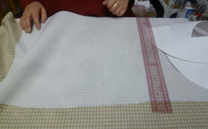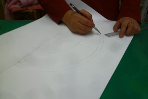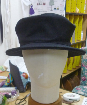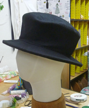 アトリエにある、この帽子をパターンを引いて製作します。 ブリム。クラウンパターンを引いています。 表生地に接着芯を貼っています。 ブリムを裁断しています。トップクラウン、サイドクラウンも裁断します。 サイドクラウン、バック中心を縫っています。 ブリムのバック中心を縫っています。