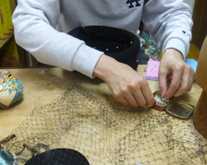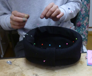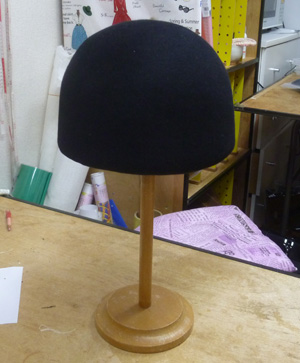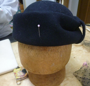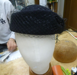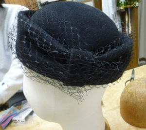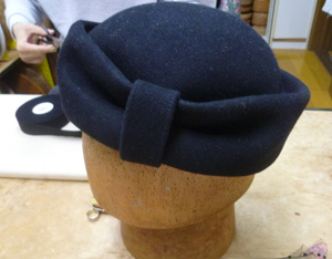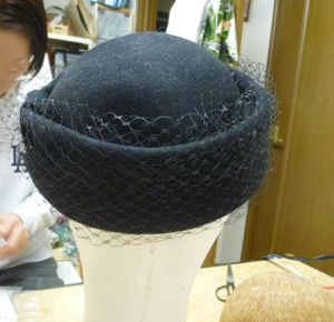 サイドクラウンのところにぐるっと、巻きました。出来上がりました。喪服用にするそうです。