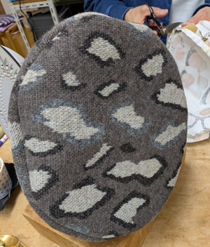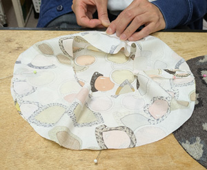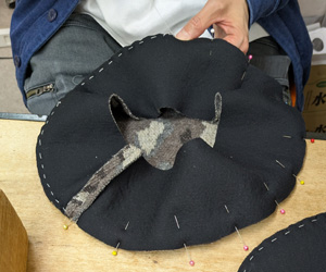ベレー帽、裏地トップクラウンとサイドクラウンを縫い合わせ。 表地サイドバック中心を縫っています。